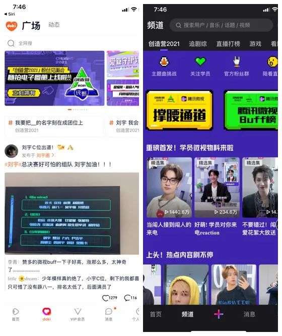 目前腾讯视频的第二屏doki广场已经成了“创4专区”,信息流中几乎都是粉丝的表白和打call。而微视频道首页也仿佛成了“创4”官网,被撑腰通道和buff榜单霸屏。腾讯打的如意算盘是:用户在微视中抢先观看高能看点,在腾讯视频观看比赛实况,在doki广场上向学员表白,在微视中为他撑腰,刷学员的专属视频物料刷到停不下来。